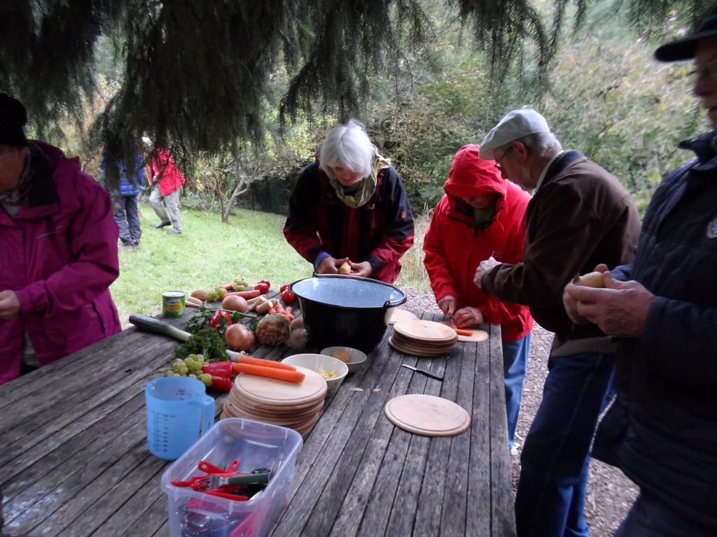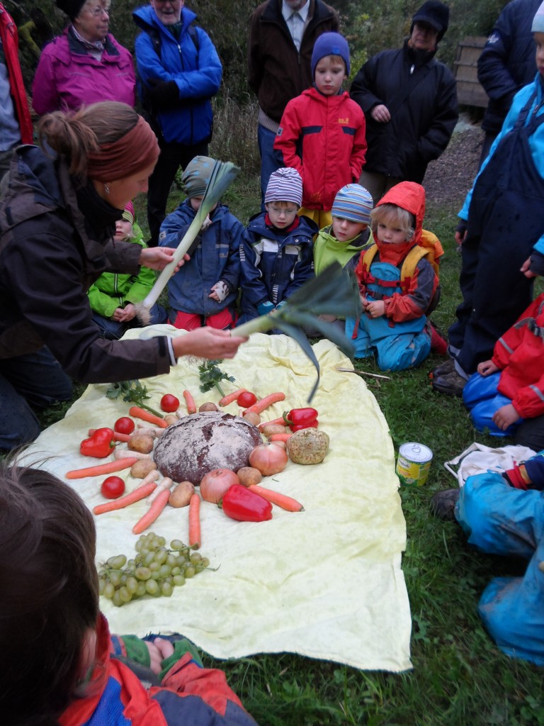 Am vergangenen Freitag führten stolze Waldkinder ihre Großeltern in den Kindergarten. Die Omas und Opas durften den Vormittag gemeinsam mit ihren Enkeln im Wald verbringen. Jetzt lernten die Oma uns Opas den Ablauf eines Kindergartentages kennen. Bei leichtem Nieselregen wanderten die rüstigen Großeltern mit Erziehern und der Kindergartengruppe zum Begrüßungskreis. Wie jeden Morgen wurden die Kinder gezählt und der Tag besprochen. Dann ging es weiter zum Gartengrundstück . Dort führten die Kinder das kurze Stück von der „Rübe, die geerntet werden soll „auf. Da Erntedank gefeiert wurde legten die Erzieher mit den Kindern ein Bild aus Karotten, Kartoffeln, Äpfeln und Brot und dankten für die Speisen. Nun durften die Omas und Opas ran. Die Großeltern schnippelten das Gemüse und kochten am Lagerfeuer für alle einen leckeren Eintopf .