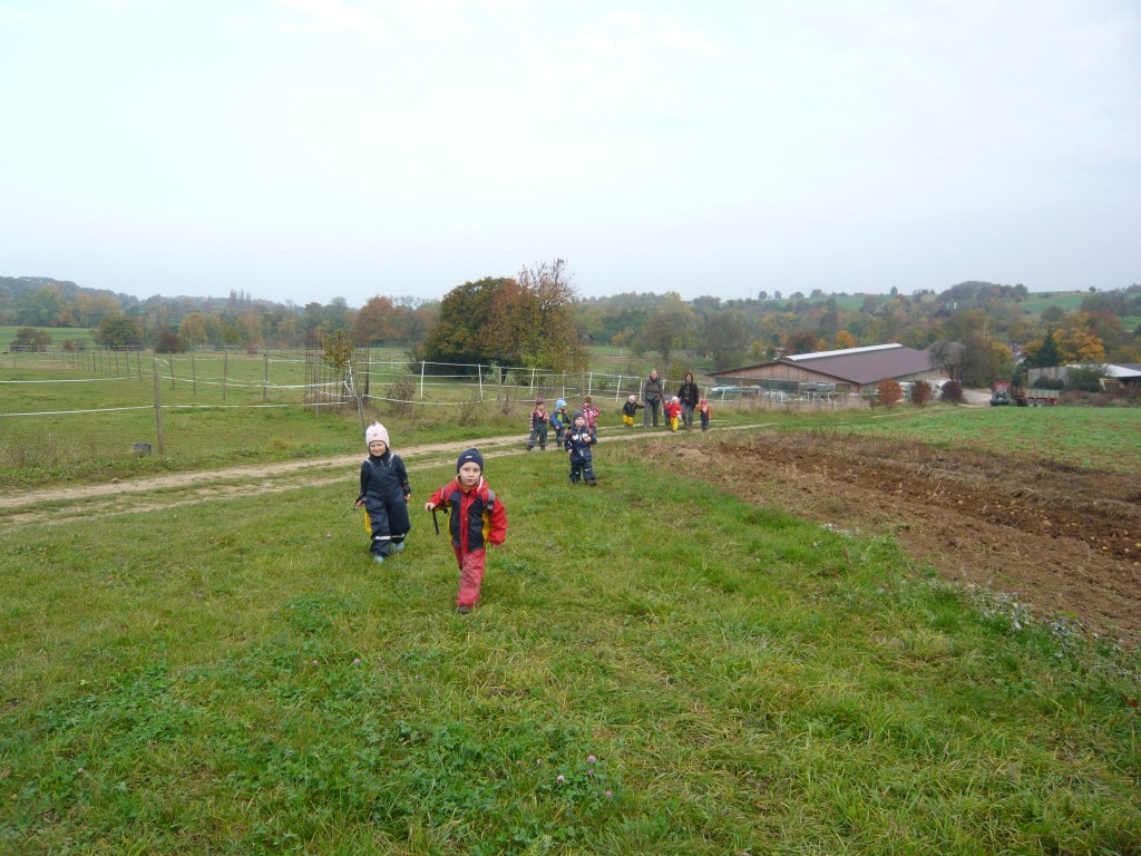 Nach dem Essen wanderte die Gruppe durch verschlungene Pfade zum Bauwagenplatz, zur Schutzhütte ,zu den Kletterhügeln und wieder zum Gartengrundstück zurück. Voller Freude zeigten die Kinder ihre Aufenthaltsorte. Die Kinder erzählten, wie dort gespielt wird, wo gematscht wird und welcher Hügel sich am Besten als Rutsche eignet. Wieder im Garten angekommen fand der Abschlusskreis statt und die ersten Großeltern wurden bereits abgeholt.