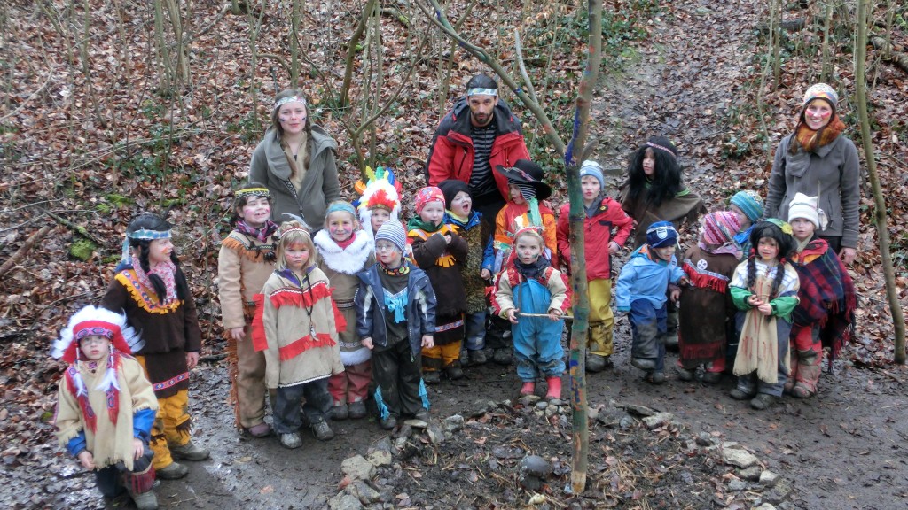 An Fasching schlichen viele Indianer im Eichelbergwald umher. Die Indianer versammelten sich ums Lagerfeuer, grillten Stockbrot und sangen Lieder. Die Anerkennungspraktikantin Nadja wählte das Leben der Indianer als Jahresthema und bastelte mit den Kindern vorab Federschmuck und Perlenketten. Im Begrüßungskreis erhielt jedes Kind einen Indianischen Namen. Dann spielte Drachenfeuer mit Schneller Katze und Schlauer Wolf mit Lauter Donner und zum Abschluss lauschten die Kinder den Geschichten über das Leben der Indianer.